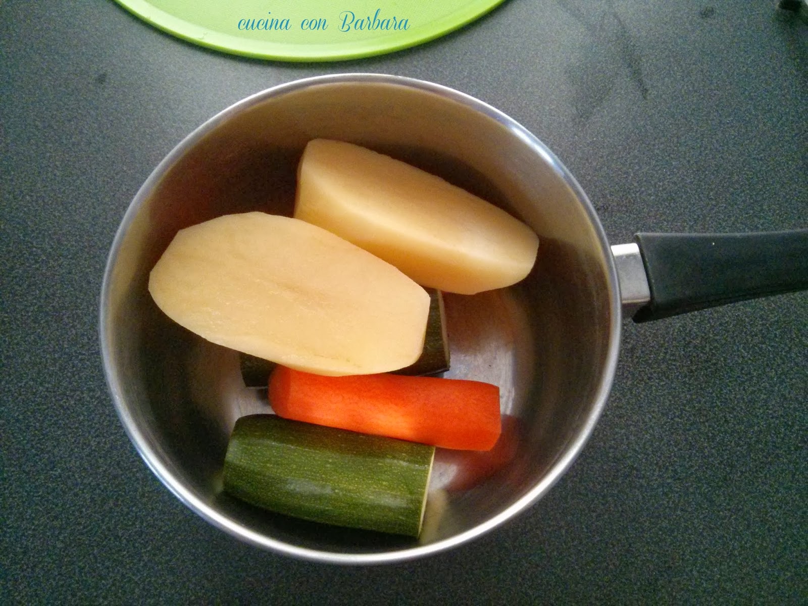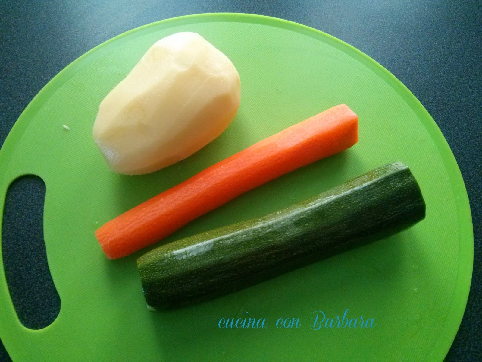 Sbucciamo la patata, peliamo e spuntiamo la carota e spuntiamo la zucchina.