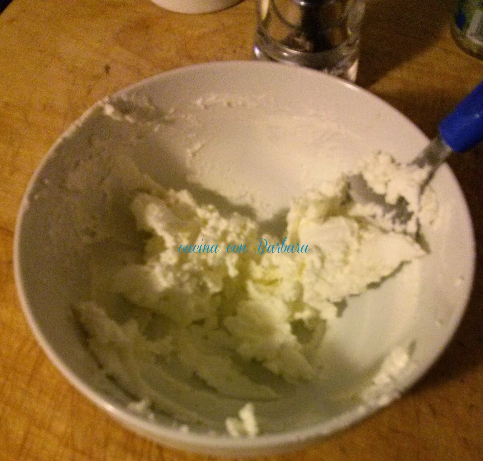 In una ciotola ammorbidiamo il formaggio spalmabile e lo insaporiamo con olio, sale e pepe. Io ho usato un sale particolare aromatizzato al basilico.