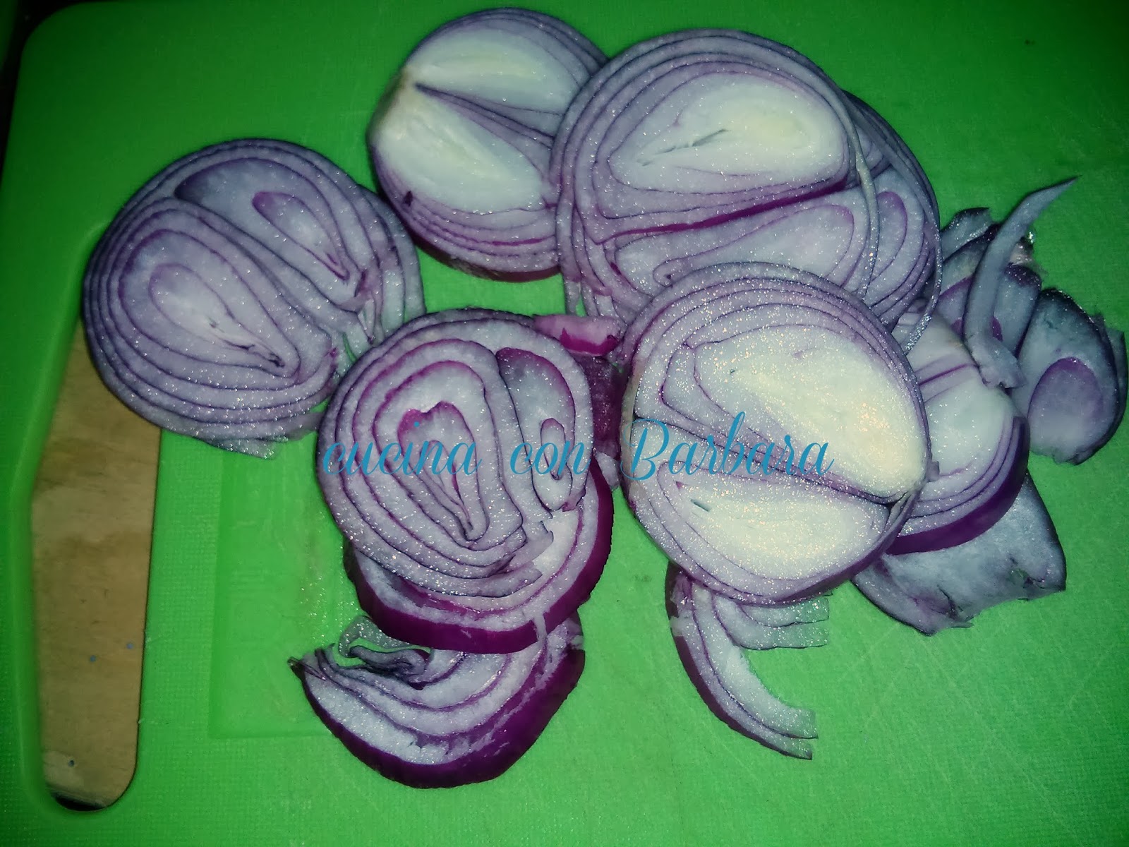 Con una mandolina affettiamo una cipolla rossa così da ottenere anelli di cipolla tutte alte uguali.