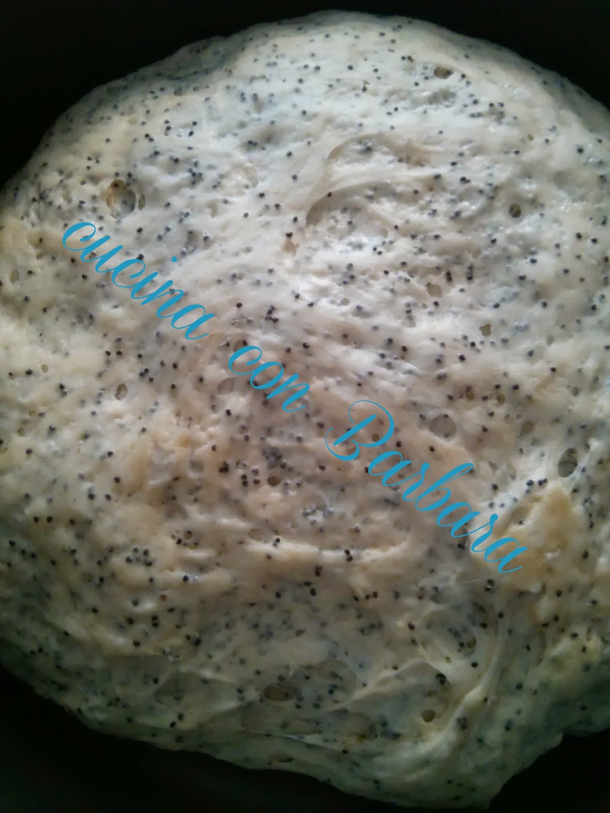 Per l'impastatura io utilizzo la funzione del forno/macchina per pane, quindi verso nella teglia impastatrice gli ingredienti e faccio mescolare fino ad ottenere una palla di impasto liscio e omogeneo.