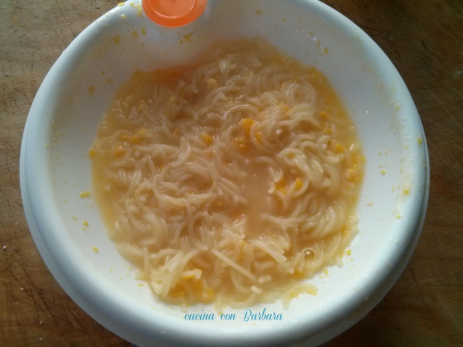 Pronta la pastina la versiamo nel piatto e mescoliamo fino ad amalgamare il tutto.