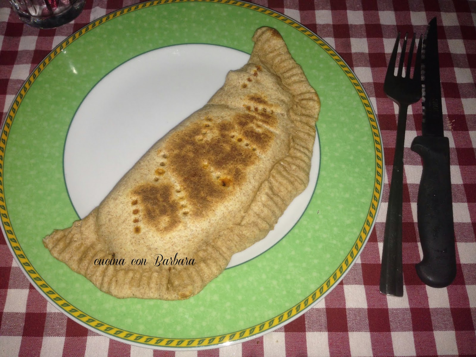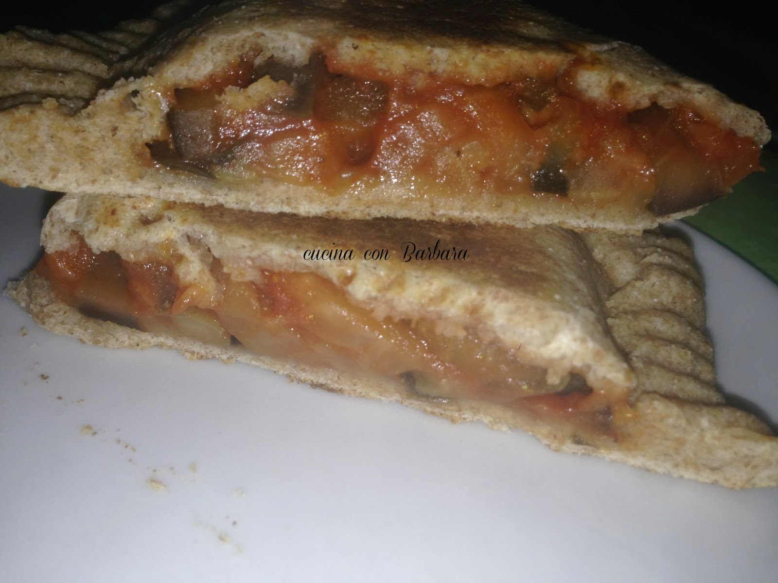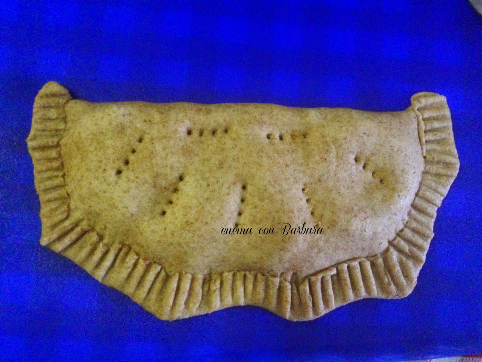 Stendiamo la pallina tipo piadina, farciamo metà "piadina" con la farcitura (melanzane passate in padella con passata di pomodoro, olive nere, sale, olio evo, origano e curcuma) chiudiamo i bordi, li ripieghiamo e li chiudiamo bene con i rebbi della forchetta. Bucherelliamo la superficie.