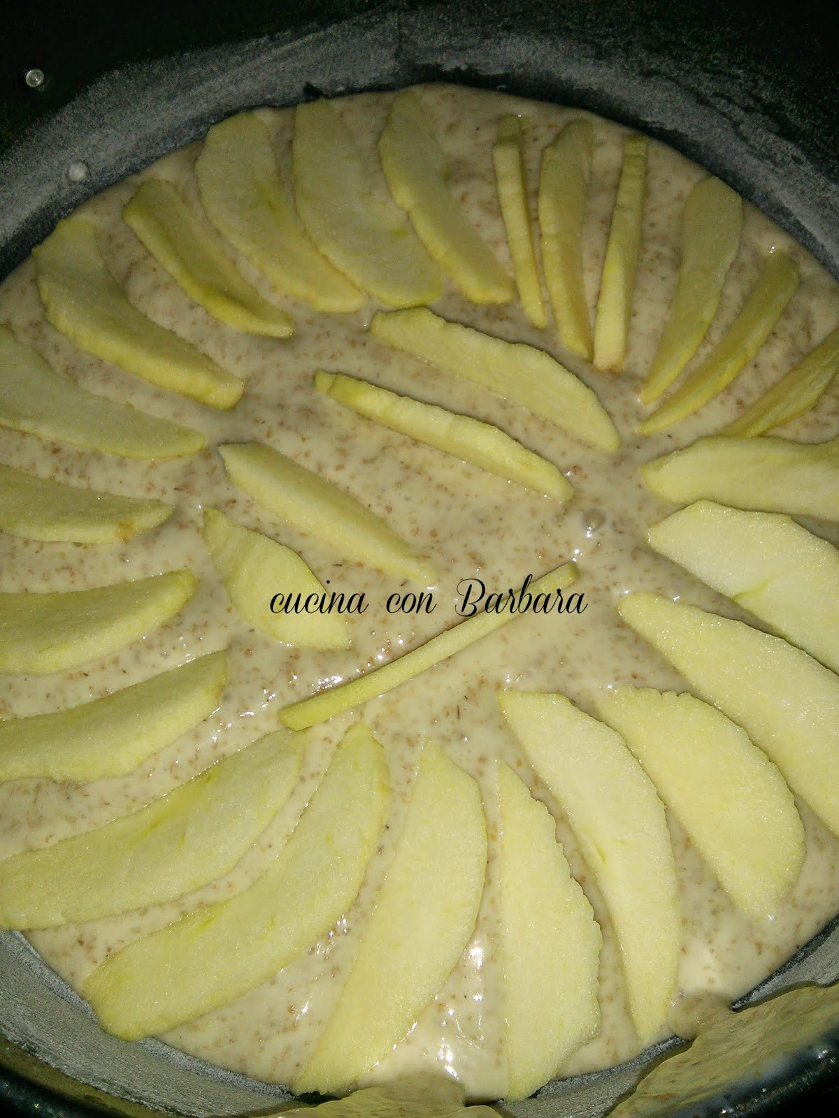 Prendiamo una tortiera da 20 cm la infariniamo o rivestiamo di carta forno e vi versiamo il composto. Sbucciamo la mela e la affettiamo a spicchi cercando di mantenere lo stesso spessore. Disponiamo le fettine di mela a raggiera nella tortiera.