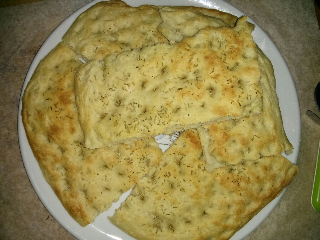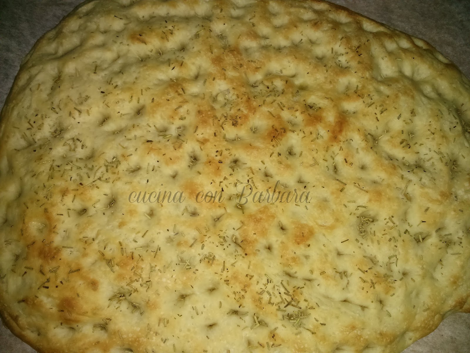 Finita la lievitazione, formiamo i tipici buchi della focaccia con le dita la ungiamo, io lo cosparsa di rosmarino.
