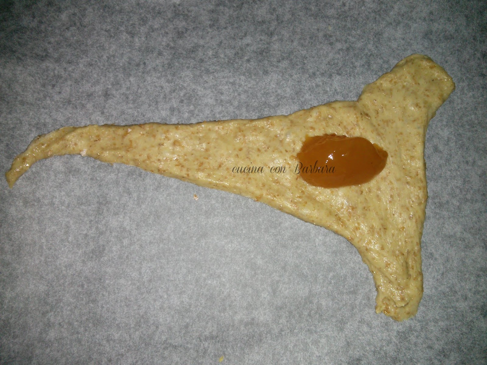 Farciamo i triangolini con la marmellata e li arrotoliamo su se stessi dando la classica forma dei cornetti.