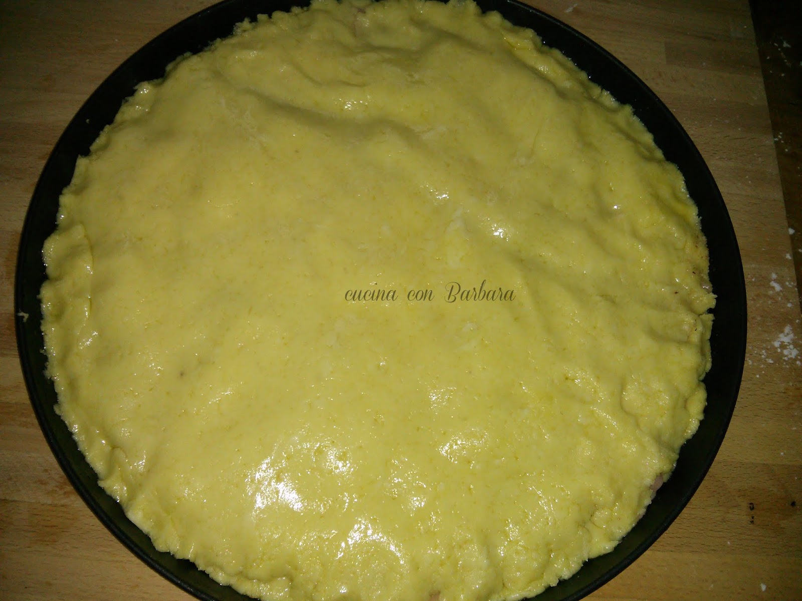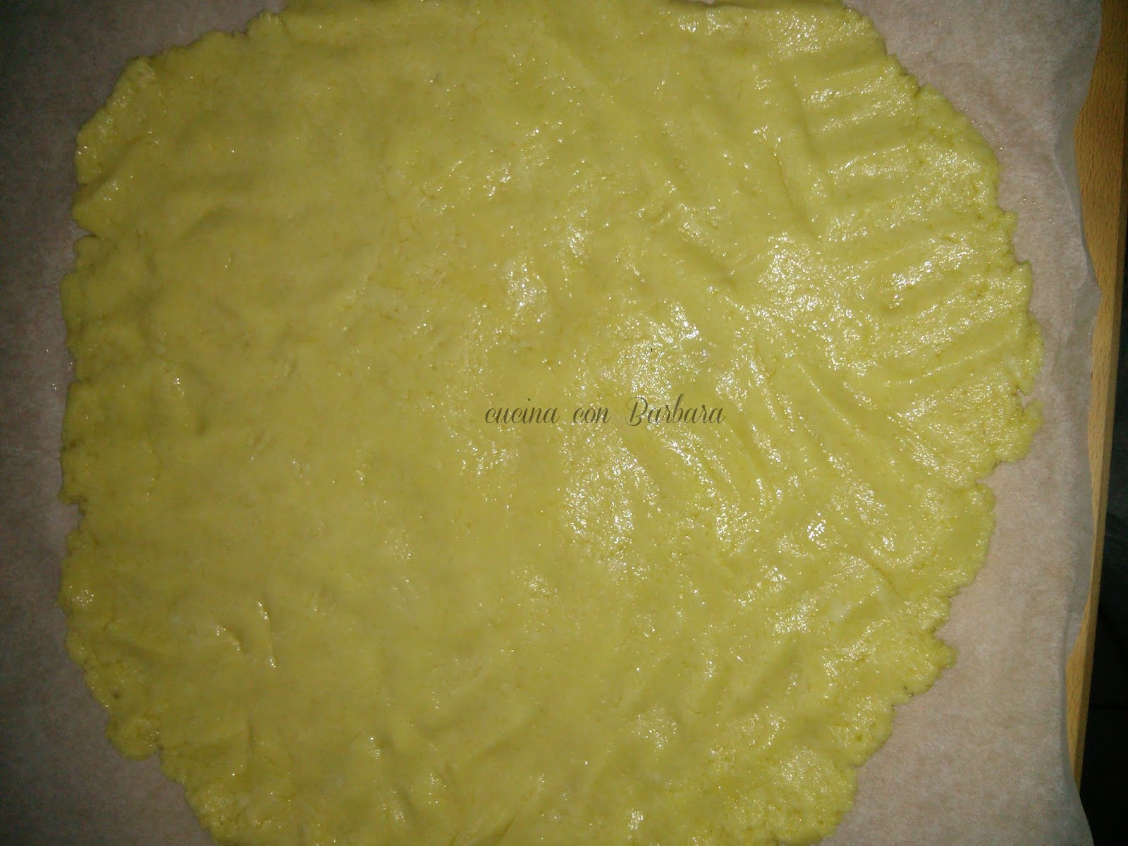 Ho diviso l'impasto in due e preso un foglio di carta forno ho steso la prima parte.