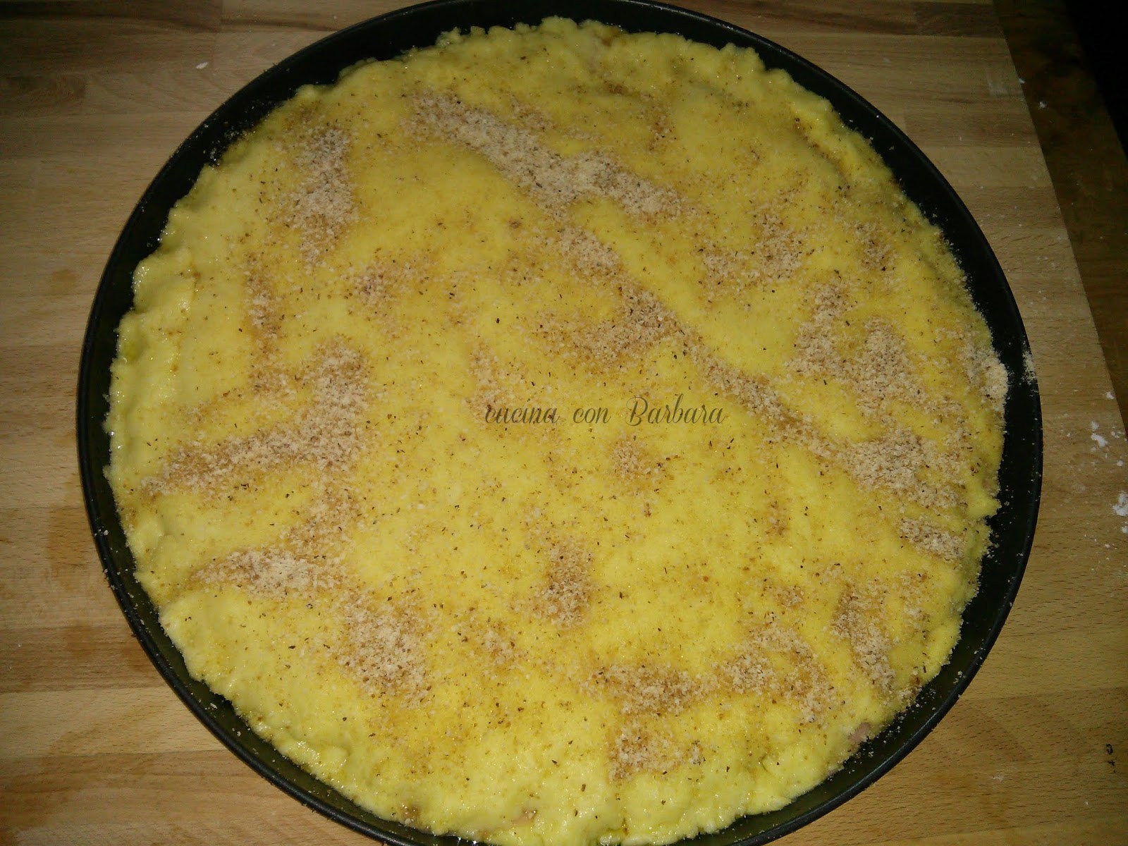 Ho versato nella teglia del pan grattato e vi ho versato sopra l'impasto steso in precedenza sulla carta forno.